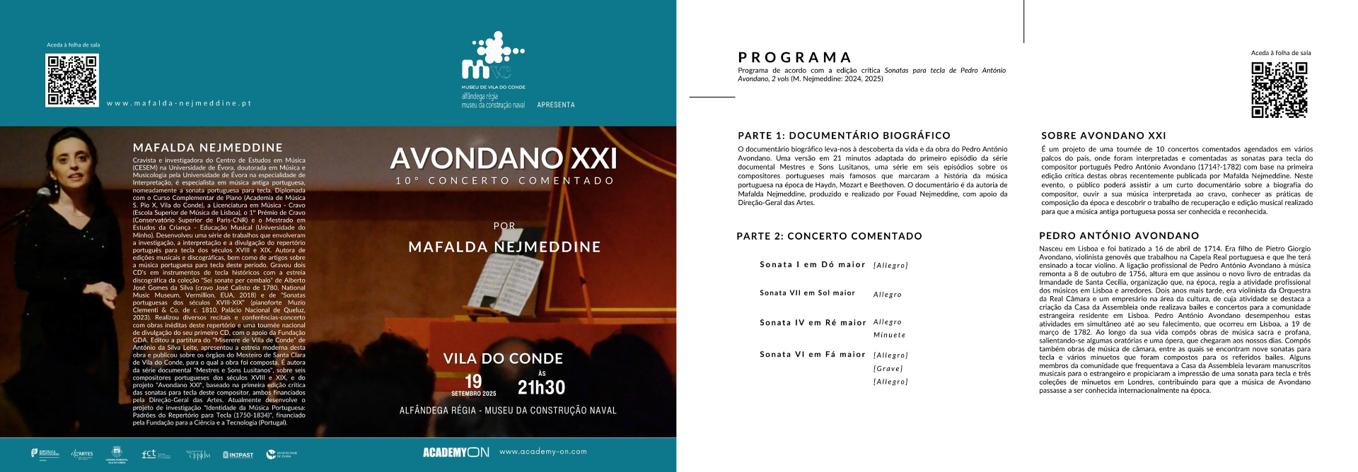 Cultural dissemination project about 18th-century Portuguese musical heritage and how it can be valued in the 21st century. This is a tour scheduled in several cities, schools and conservatories across Portugal, featuring Lecture-recitals based on the first critical edition of the keyboard sonatas of Portuguese composer Pedro António Avondano (1714?-1782). The aim of the tour is to encourage students and teachers to breathe new life into this composer's work in 21st-century schools and cultural spaces.